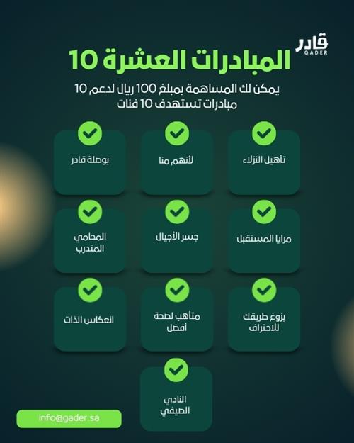 🎯 بطاقة: المبادرات العشر ساهم بسهمك.. وكن شريكًا في صناعة مستقبل 10 فئات شبابية بـ 100 ريال فقط للسهم الواحد، تفتح بابًا للأمل، وتُسهم في دعم 10 مبادرات شبابية نوعية تستهدف: طلاب الجامعات – الباحثين عن عمل – الموهوبين – رواد الأعمال – المتطوعين – التعليم العام– الباحثين عن عمل– قادة الأندية – حديثي التخرج – الفتيات الطموحات. 🧡 كل سهم تقدّمه = فرصة تغيير حقيقية لشاب/ـة يحتاج إلى تمكين وتوجيه. • تقدر تساهم بـ: 🟧 سهم واحد (100 ريال) 🟧 سهمين (200 ريال) 🟧 ثلاثة أسهم وأكثر (كل سهم = أثر جديد) 🌟 لا تنتظر أن تأتي الفرصة للشباب… كن أنت من يصنعها.